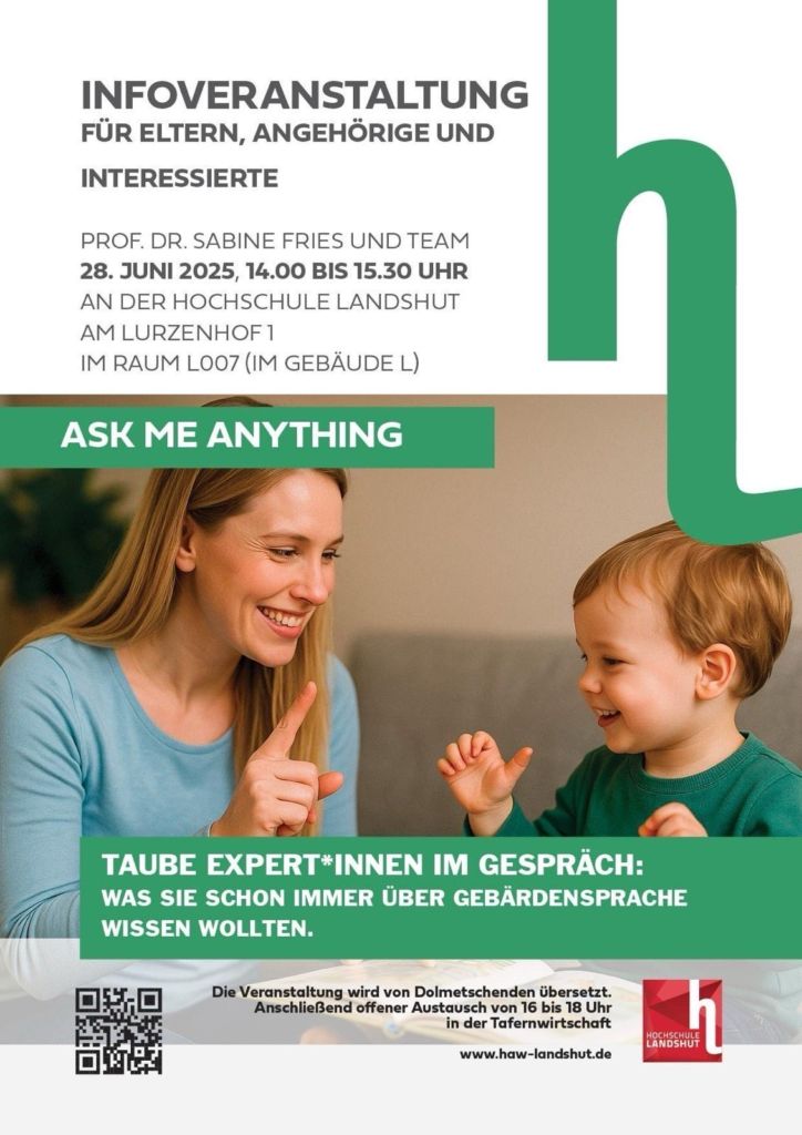 Am kommenden Samstag findet an der Hochschule Landshut ein Vortrag zum Thema Gebärdensprache statt, der von Frau Prof. Sabine Fries und ihrem Team gehalten wird.
