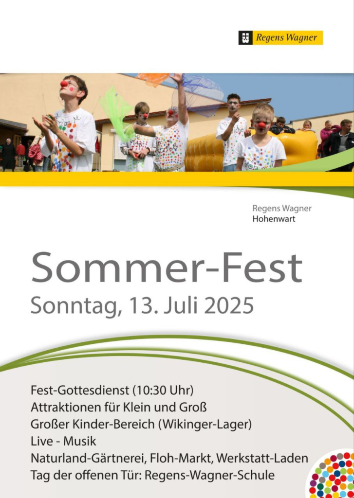 26. Juni 2025 Sommerfest Regens-Wagner (Hohenwart)Liebe Eltern, liebe Mitglieder. Wenn ihr am 13. Juli Zeit habt, schaut doch mal beim Sommerfest von Regens-Wagner in Hohenwart vorbei. Anbei findet ihr das Plakat: