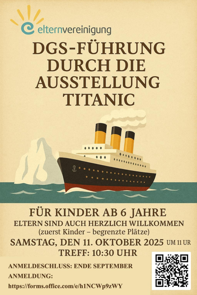 Wir haben ein weiteres Programm auf die Beine gestellt. Am 11. Oktober haben Kinder ab 6 Jahren die Möglichkeit, die Titanic-Ausstellung im Lokschuppen Rosenheim zu besuchen. Die Führung wird in DGS/Lautsprache stattfinden.